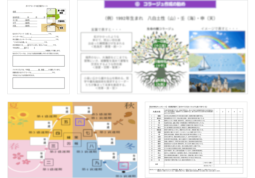 他の方に自分の九気を説明するための「自己紹介シート」をはじめ、講義の学びを深めるためのワークシートをセクションごとに用意しています。聞いて満足せず、ワークシートにメモを残しながら落とし込み、使える知恵に変えていきましょう!