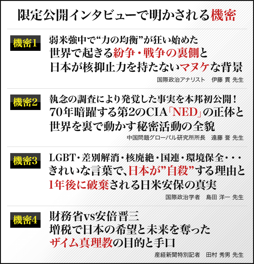 今回4つの動画を通じてお届けする内容は、政治・経済の分野の第一線で活躍する第一人者が多くの敵や反勢力と闘いながら、ようやくたどり着いた結論、世界が見過ごし埋もれてしまっていた真実、あるいは表舞台から姿を消した不都合な真実です。
